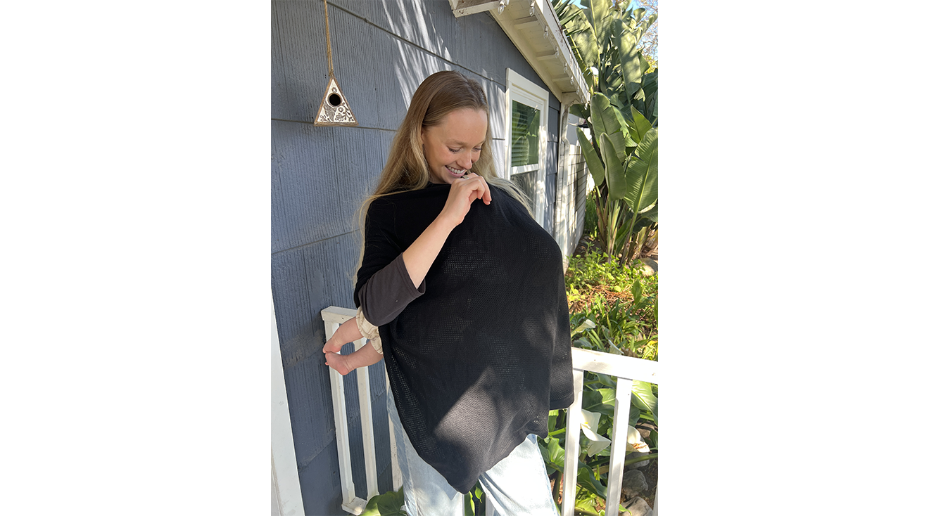 As she mentioned, Christina was a big fan of how well this poncho was designed, and she loved its silhouette and color. “This is my favorite nursing cover I've ever tried because of the shape and size. It's so easy to put on and take off,” she shared, “I actually wore this the whole day because it's so stylish.” Even better, she said that the flowing bottom hem and long length made it straightforward to position baby while breastfeeding. “Because of the way it's designed, it's impossible for it to come undone or show any skin on the sides,” she explains, adding that it’s also “impossible for baby to kick off while nursing.” Christina also told us that the neckline allowed her to easily make eye contact with her 7-month-old when feeding.