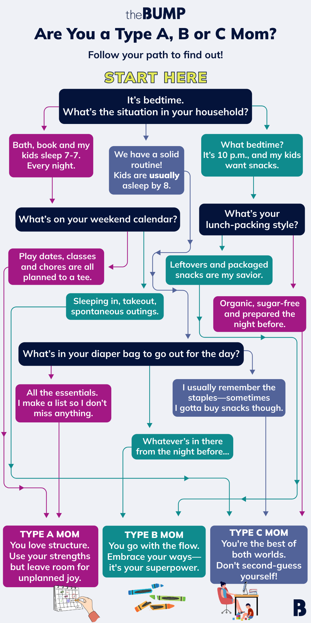 While we should celebrate all types of moms, finding out which type you are can be fun in a Cosmo-quiz way. Follow the arrows in our flowchart to see whether you’re more of a type A, B or C mom.