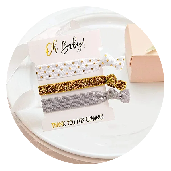 If you’re after a cheap baby shower favor that combines cuteness and practicality, look no further than these hair ties. The white-and-gold-colored packs will add a touch of glam to any table setting or gift bag. Available in three shimmering styles, they’re perfect for boy, girl or gender-neutral baby showers.