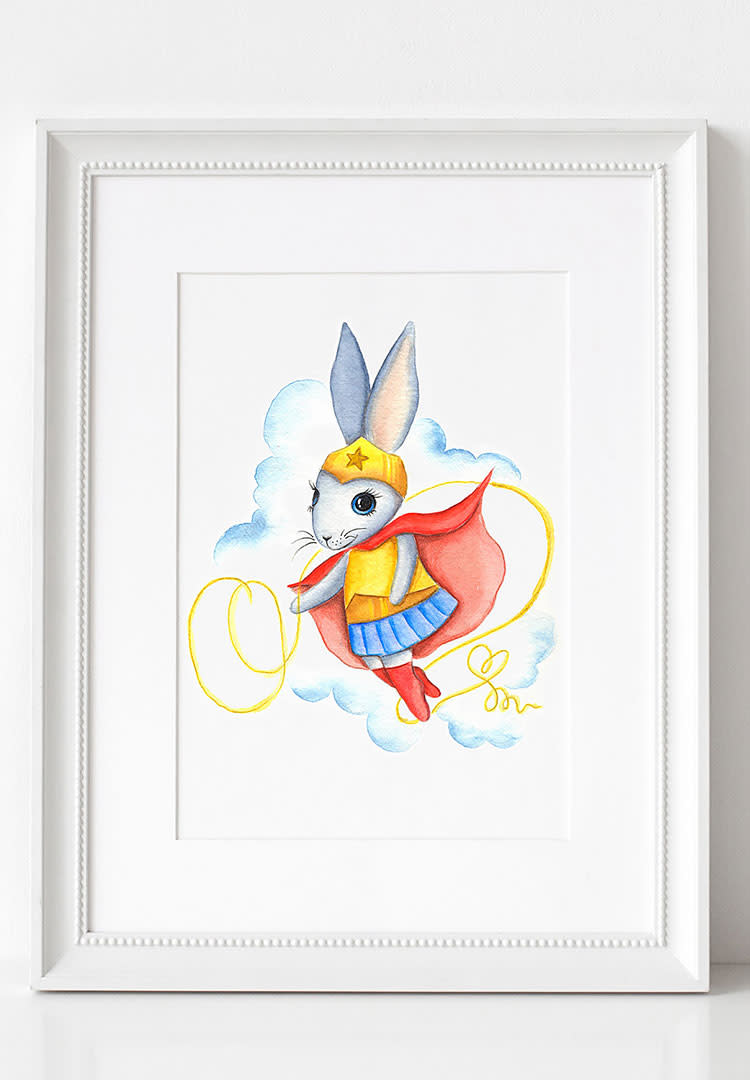 You want a true piece of kid-friendly Wonder Woman art? Look at this adorable illustration of Wonder Woman as a bunny, with her long ears and her lasso of truth. (Look close—it’s curled into a heart at the end.) As far as nursery art goes, this is about as cute as it gets.