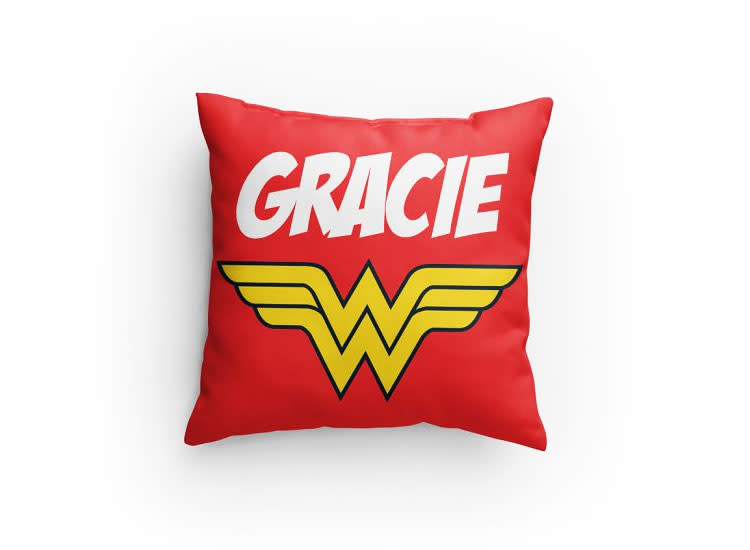And finally, if you have a little girl who’s perhaps not ready to commit to an entire Wonder Woman room, but still wants to represent, we adore this customizable Wonder Woman pillow. Done in classic red, it features Wonder Woman’s logo and your little girl’s name, while the back reads, “Even Wonder Woman needs her sleep.” (Too true!)