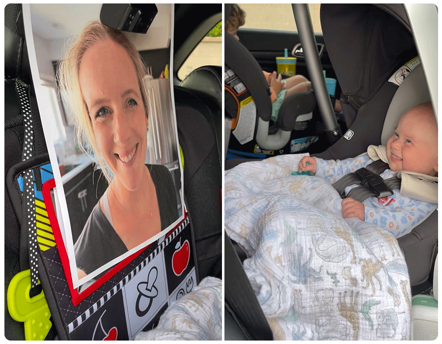 Since having his wife in the car every day wasn’t feasible, Ciccone’s husband came up with the next best thing. “I was standing in the kitchen, and he comes up to me and asks me to smile—then he snaps a picture really close to my face,” Ciccone said. His clever solution? A massive printout of Mom’s face.