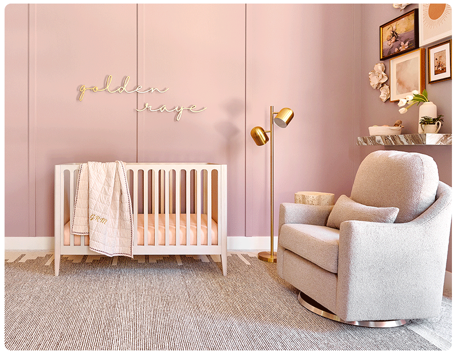 Brittany Mahomes: When I found out I was having a girl, my mind immediately went to pink for the nursery. Sterling’s nursery was also pink, but much brighter and airier. With this nursery, I wanted a cozier, moody vibe and felt like the dusty rose was the perfect palette. We shared our inspiration with the Crate & Kids Design Desk team, and were blown away by the designs they created for us.