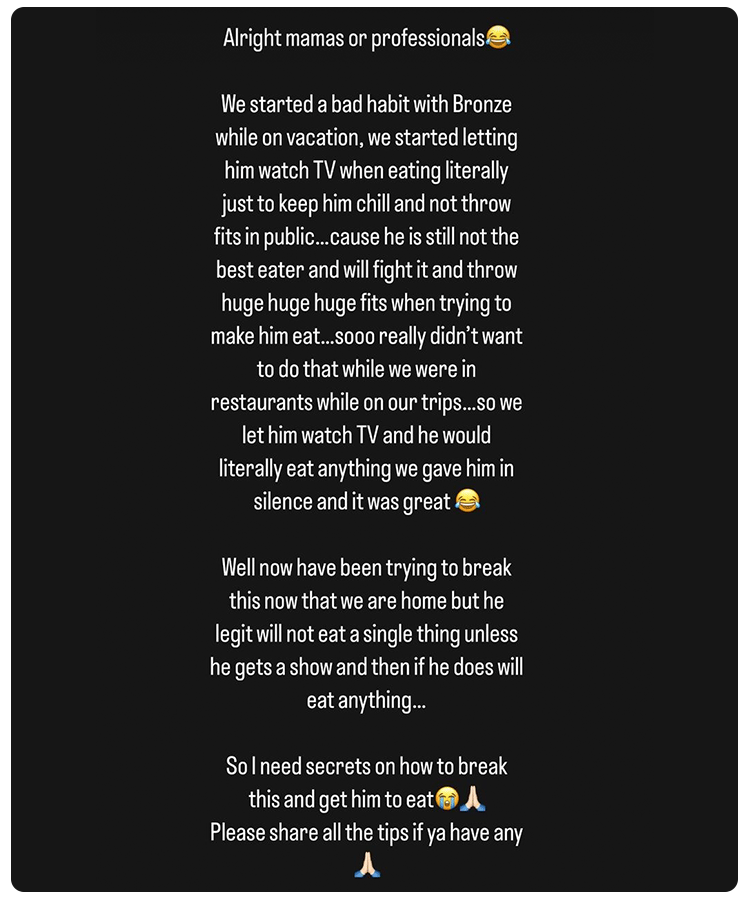 “We started a bad habit with Bronze while on vacation. We started letting him watch TV when eating literally just to keep him chill and not throw fits in public [because] he is still not the best eater and will fight it and throw huge huge huge fits when trying to make him eat. [So,] we let him watch TV and he would literally eat anything we gave him in silence and it was great!" she wrote.