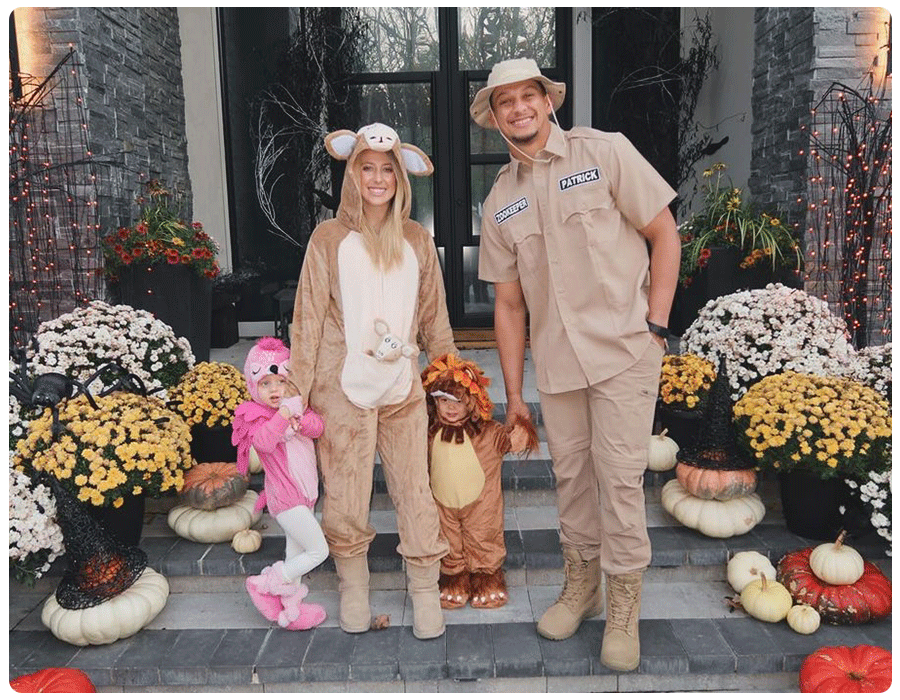 Kansas City Chiefs quarterback Patrick Mahomes took on the role of zookeeper this Halloween, overseeing his adorable zoo crew with 3-year-old Sterling as a flamingo and 1-year-old Bronze as a lion. His wife, Brittany, joined in the theme, dressing as a kangaroo with their growing little one snug in her pouch.
