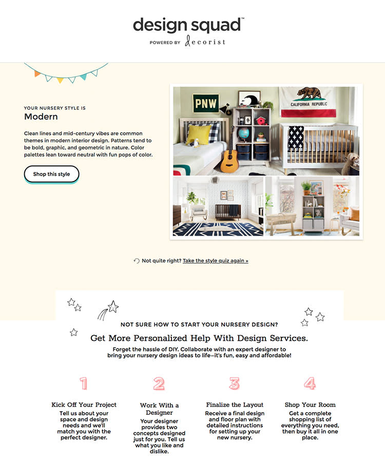 Design Squad offers an online solution with free design Q&As with professionals (many of whom are parents themselves), in-store support, dozens of curated nursery designs and a custom room design service, a blog to help provide you with all the tips, tricks and inspiration you’ll need and a style quiz, which helps you determine the right look for you with just five easy questions.