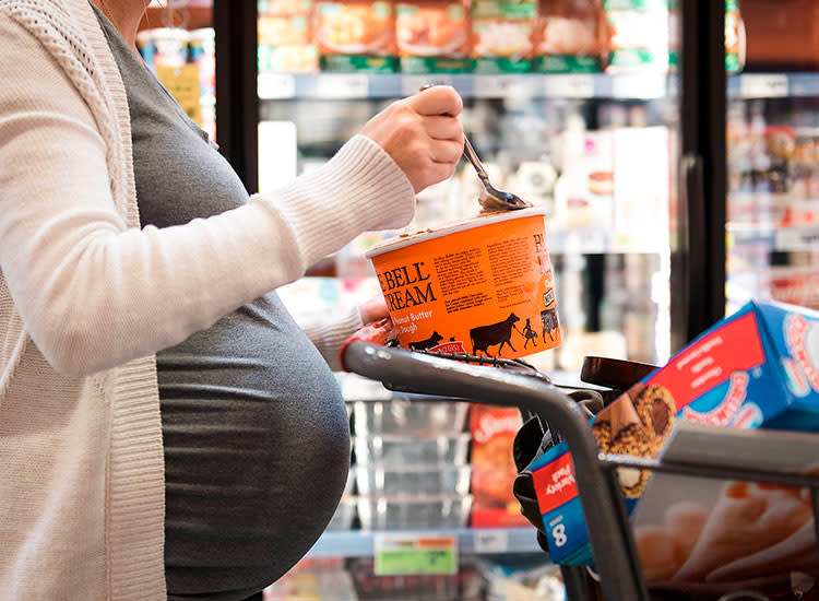 The setting for the session (a local grocery store) was a no-brainer, according to photographer Giles. “I don’t know about you, but what pregnant lady doesn’t love the grocery store?” she says. Giles captured Scott feasting on some of her most pressing cravings (kettle corn, pickles, ice cream) and topped it all off with a handful of TUMS.