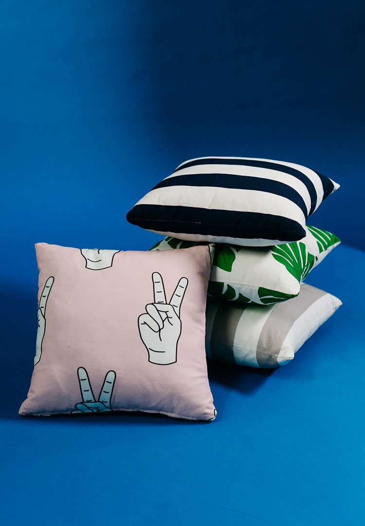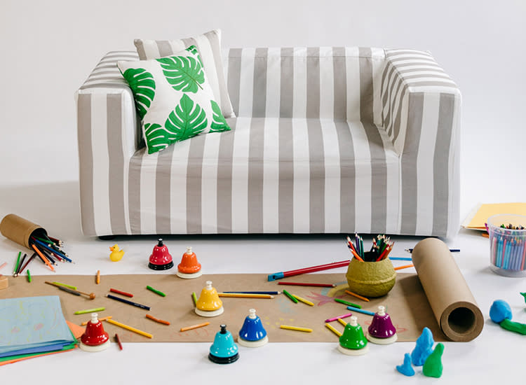 Each item can be upholstered or slipcovered with four whimsical fabrics from Monica + Andy, including Blue Stripe, Grey Stripe, Palm and Peace Out. Plus, the slipcovers are machine-washable, because, let’s be real, accidents can and do happen.