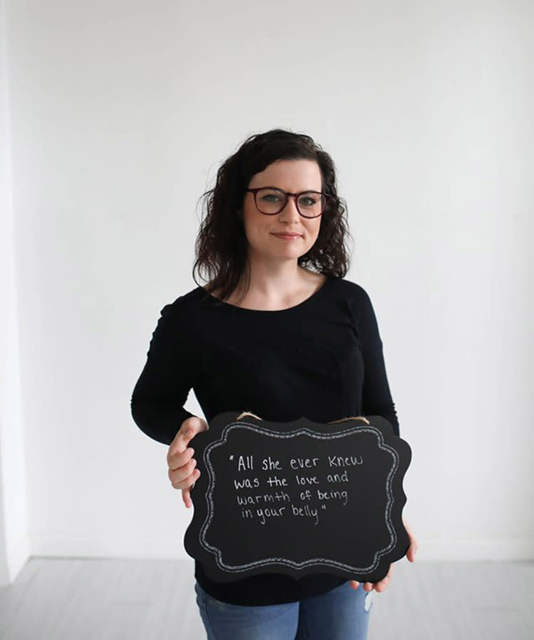 The resulting 20-plus images are all portraits of women who have experienced miscarriage holding a chalkboard sign with something a family member or friend said to them while they were recovering—the good taken in color, the negative shot in black and white.